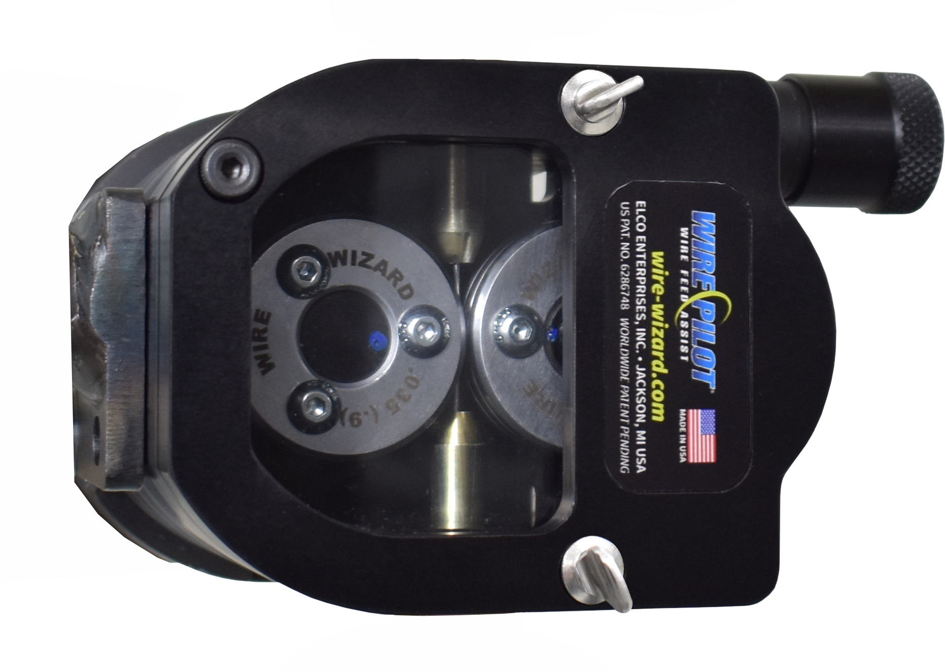 An air-powered motor pushes the wire to the outer corner of the conduit, adjusting the force to maintain mechanical tension. When welding starts, the wire is pulled into the inner-corner, reducing resistance and allowing the air-motor to run freely. This makes the wire float.